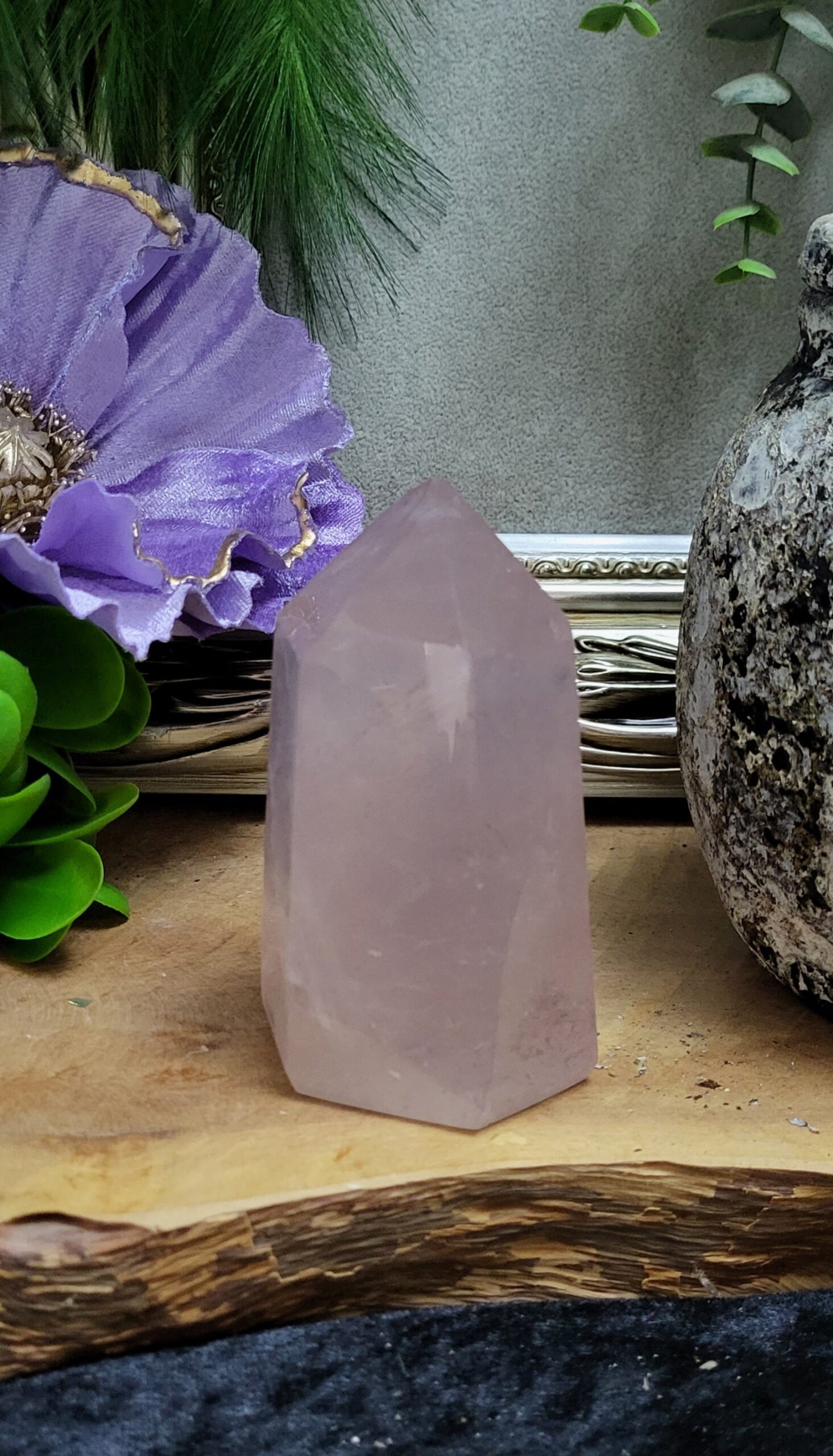 Deze Rozenkwarts punt heeft een hoogte van 9,5cm en een gewicht van 372gr. Rozenkwarts is een steen die staat voor.. Lees meer